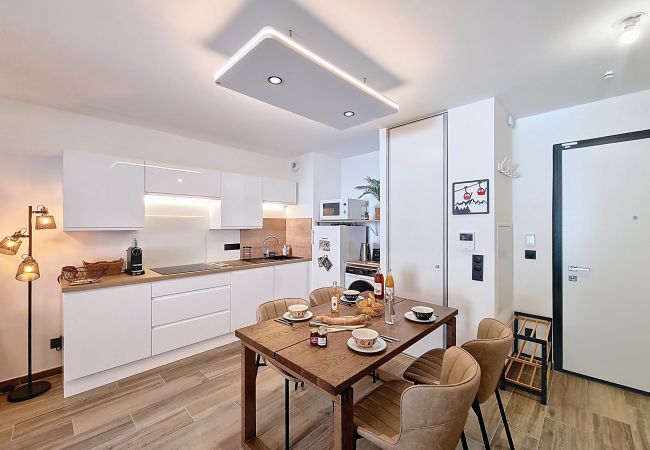 Ideally located in the heart of Les Gets village, this modern 40 m² apartment combines comfort, practicality and alpine charm. Nestled in a new residence with a lift, it features a double bedroom, a bright living room with an open kitchen and a balcony offering a beautiful view of the mountains and ski slopes. Able to accommodate up to 4 people, it is perfectly suited for couples and families wishing to enjoy a warm stay at the foot of the slopes.