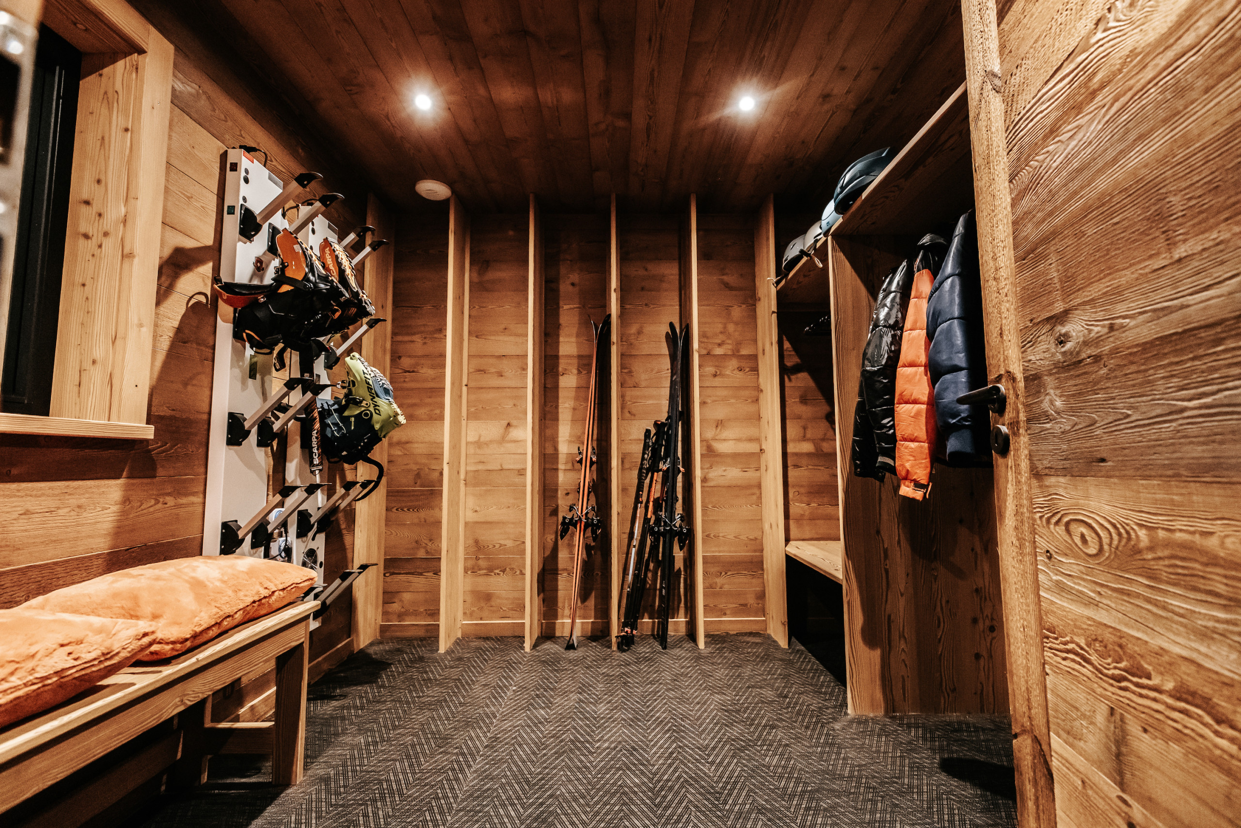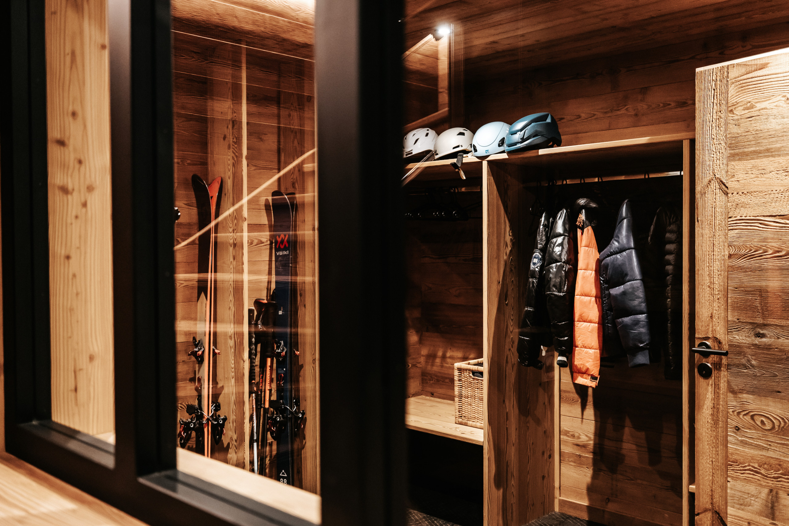 Upon entry, the chalet has a ski locker with a boot dryer, facilitating return from the slopes. A closed garage for one car, complemented by a covered garage able to accommodate up to three motorcycles, further enhances the practical amenities of the property.