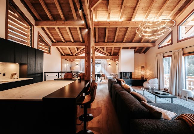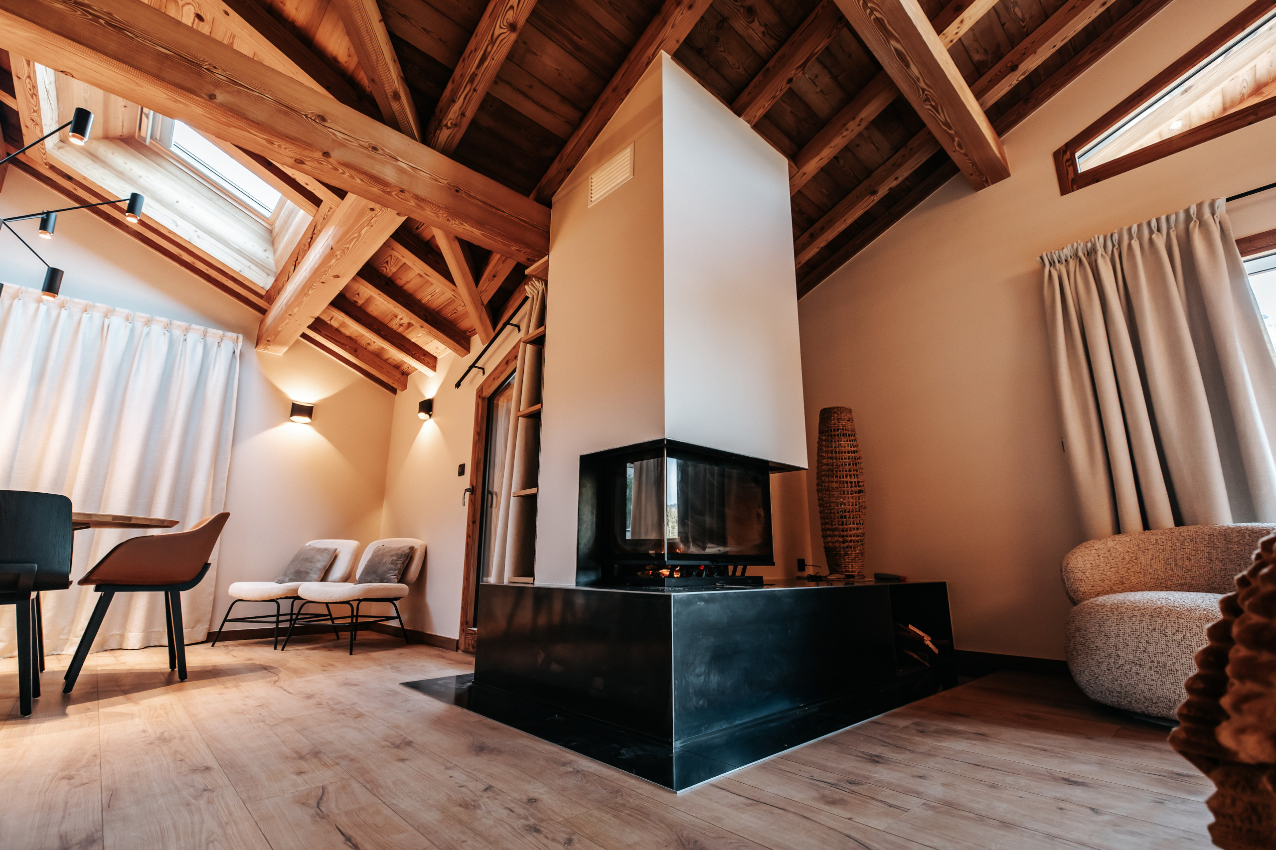 The chalet can accommodate up to 10 people thanks to its five en-suite rooms, four of which are located on the first floor and one on the top level, near the living spaces. The top floor houses a bright living area combining living room, dining room and fully equipped kitchen. The living room features an insert fireplace, bringing a warm atmosphere after a day in the mountains, and opens onto an outdoor terrace fitted with a professional overflow hot tub and a sauna, designed for moments of relaxation.