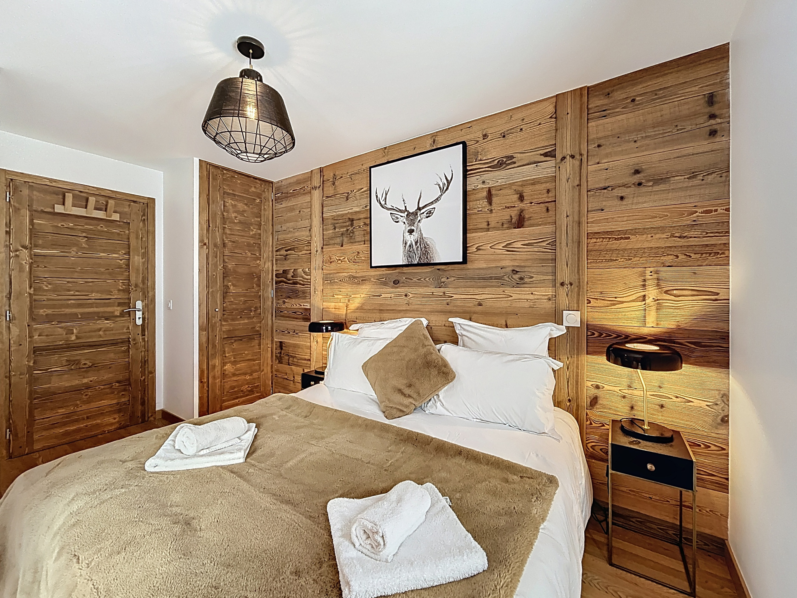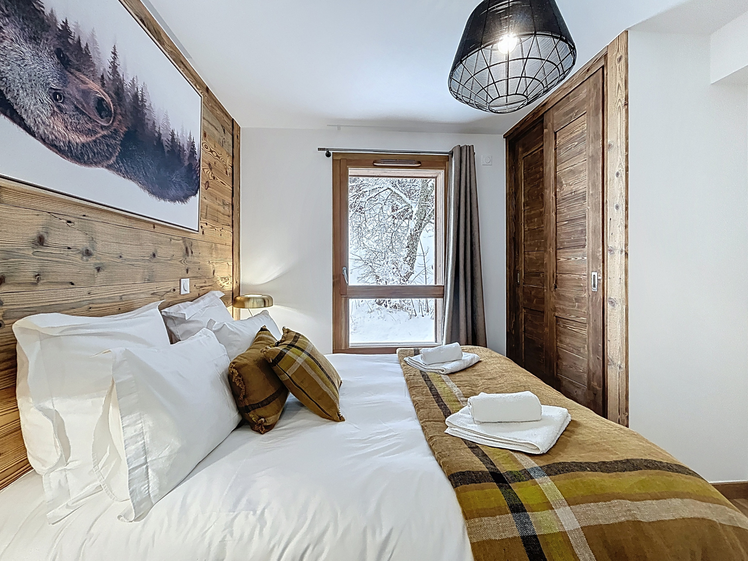 D’une superficie d’environ 103 m², l’appartement peut accueillir jusqu’à huit personnes. Il dispose de quatre chambres doubles, chacune équipée d’un lit queen size, offrant un confort optimal pour des séjours en famille ou entre amis. Les espaces de vie sont lumineux, chaleureux et parfaitement adaptés aux moments de convivialité après le ski.