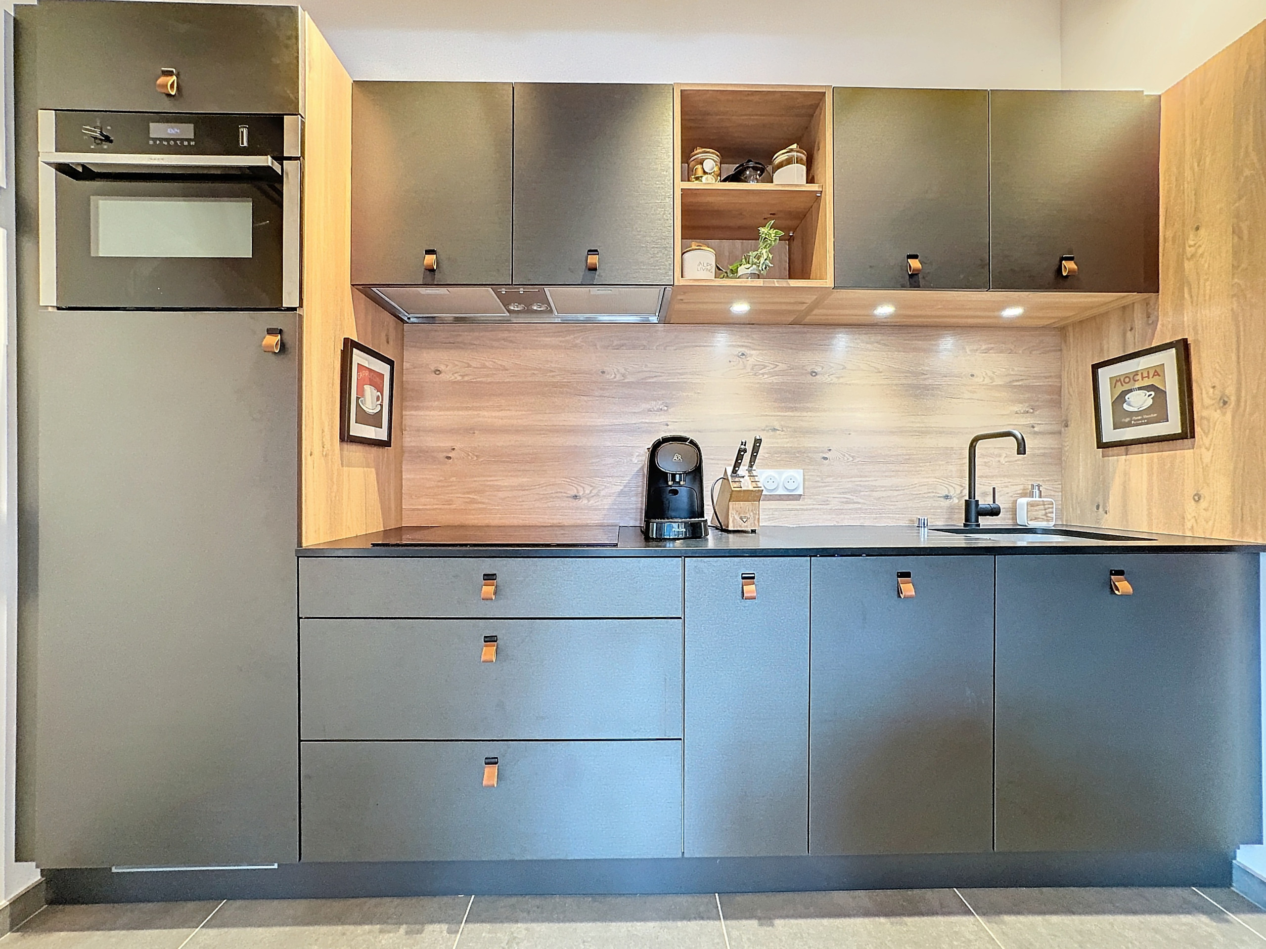 La cuisine américaine est équipée d'un réfrigérateur,d'un lave-vaisselle, d'un micro-ondes d'un appareil à raclette et d'un appareil à fondue.
