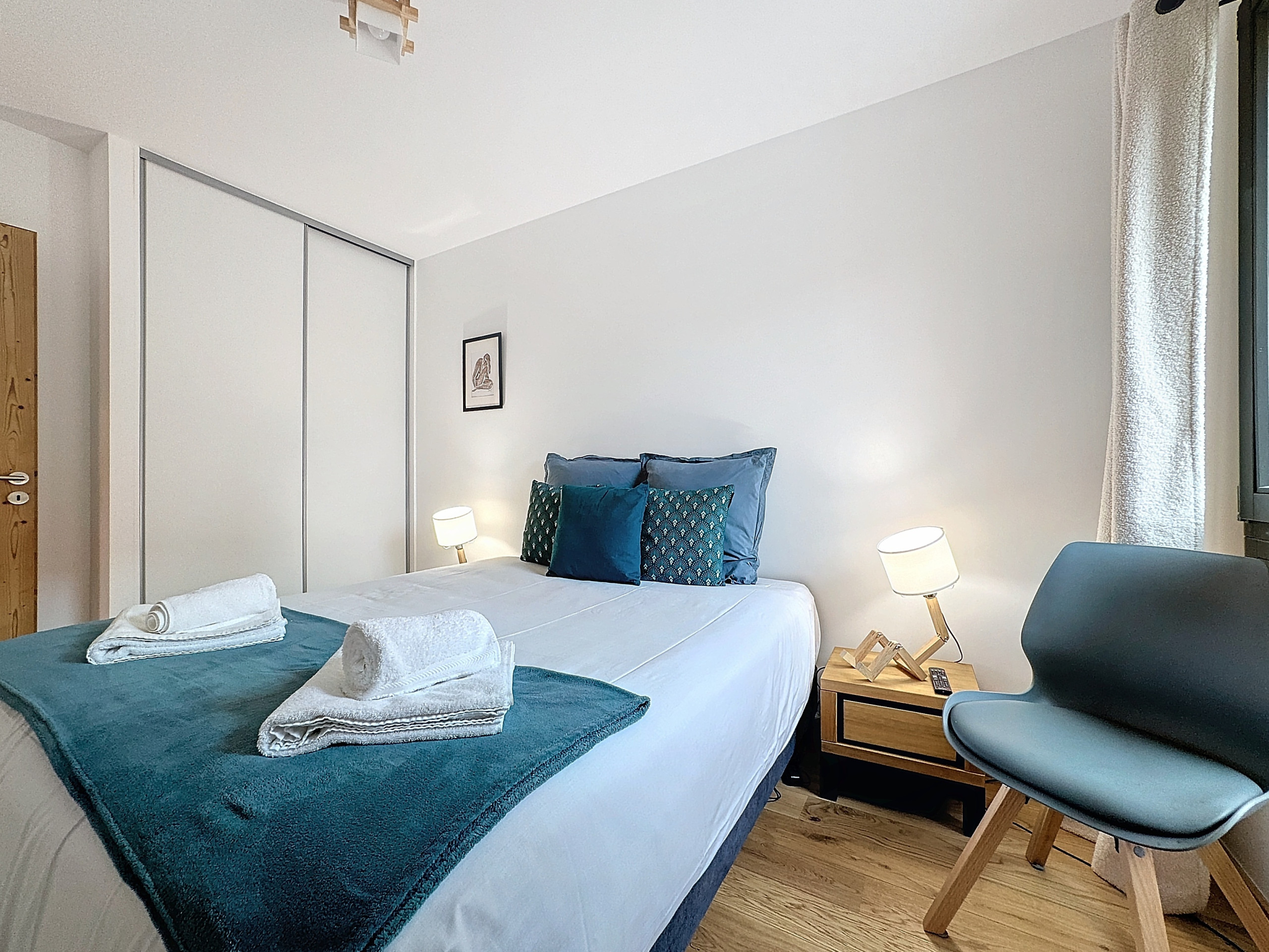 La première chambre comprend un lit en 160x200 et offre la possibilité de placer un lit bébé si nécessaire à proximité.