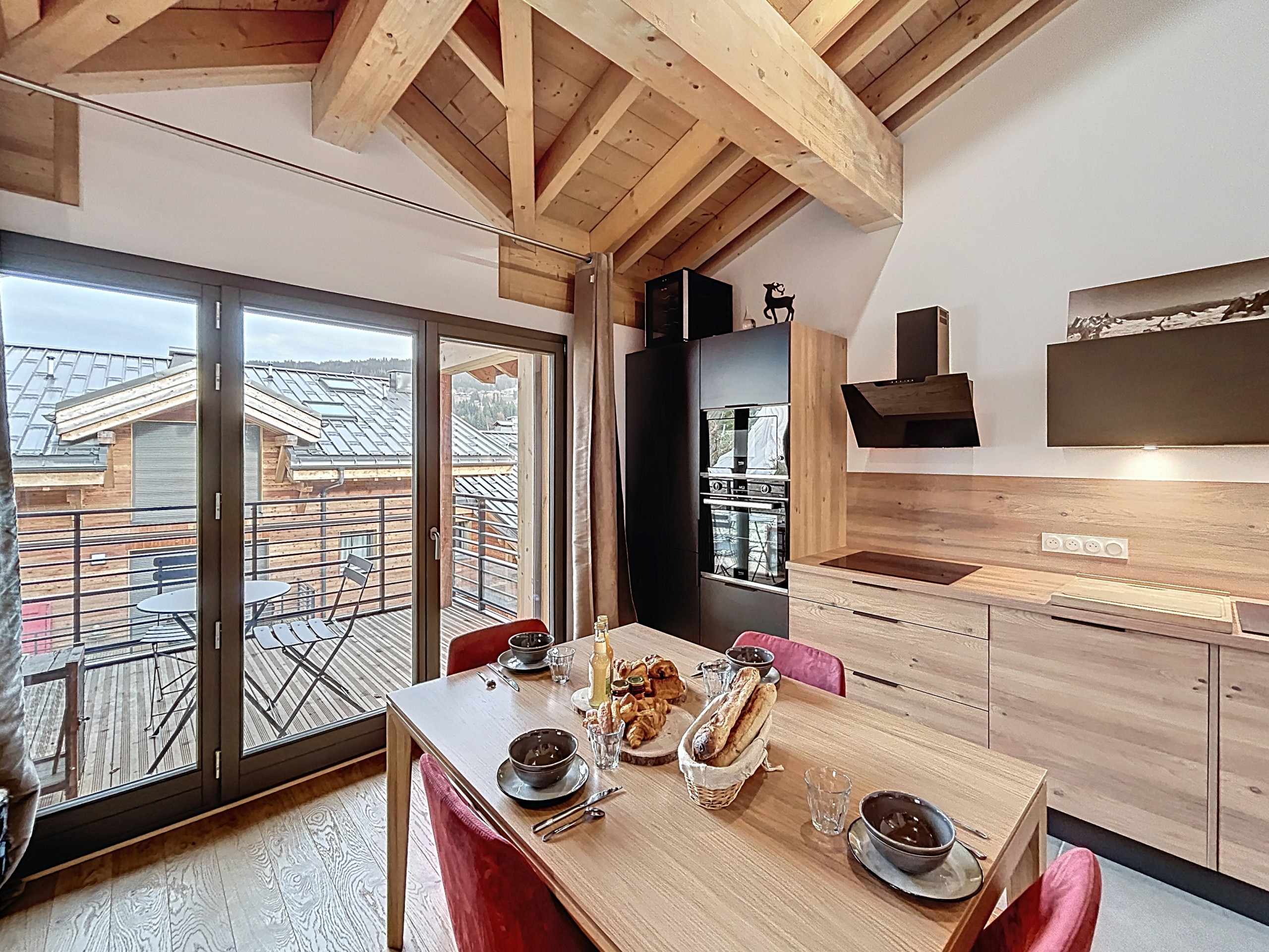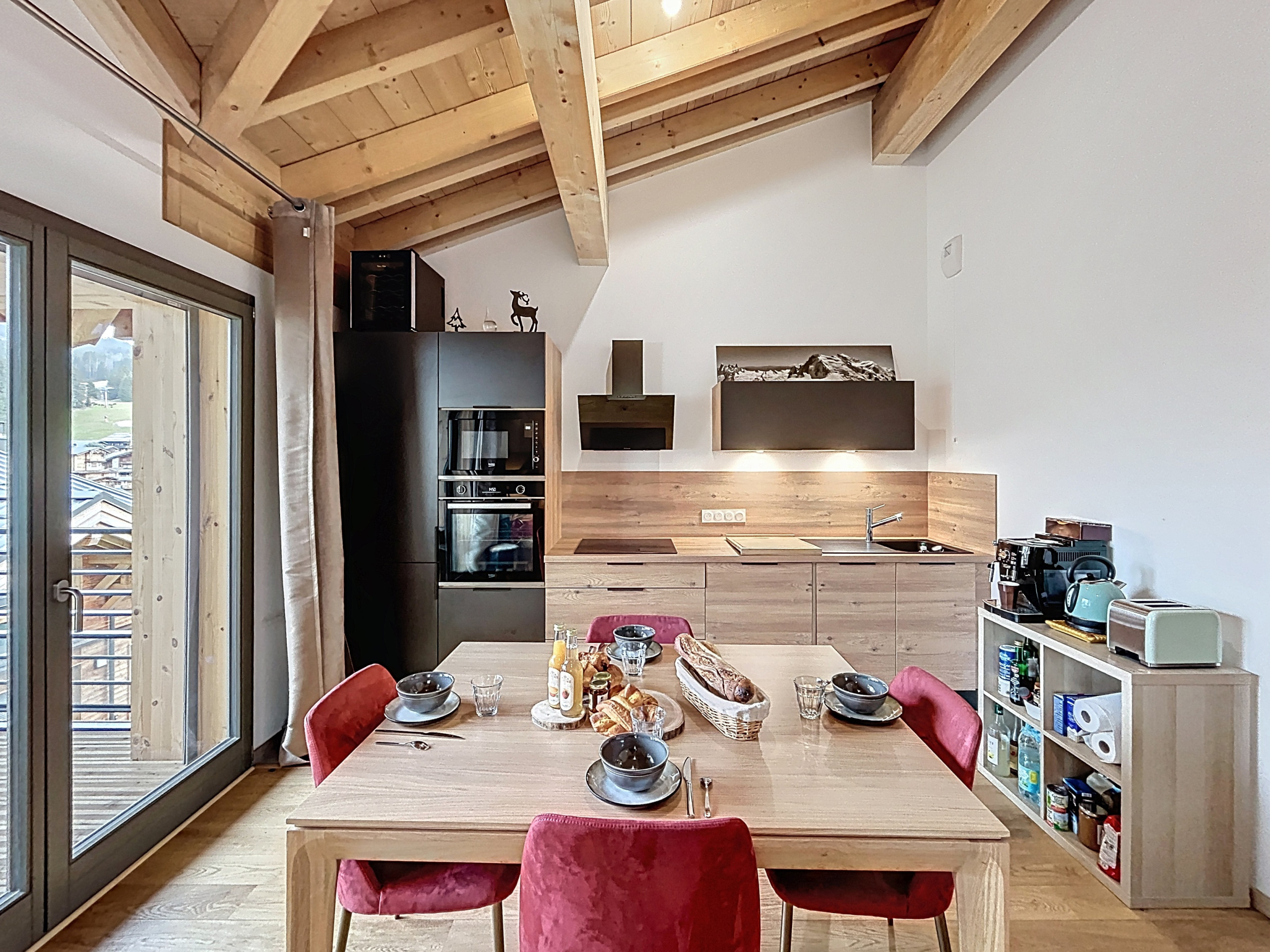 Appartement 2 chambres - Les Gets - Proche centre Cet appartement aux Gets, situé à deux pas du centre, offre un espace de 53 m² idéal pour accueillir jusqu'à 4 personnes. Faisant partie d'une résidence neuve, il bénéficie de prestations modernes et soignées. Entièrement meublé et décoré avec goût, il allie confort et fonctionnalité. La pièce de vie principale est lumineuse, ouverte sur une cuisine moderne entièrement équipée (four, plaques, réfrigérateur, lave-vaisselle, etc.) et un espace salle à manger convivial. Le salon, agrémenté de canapés confortables et d'une télévision écran plat, s’ouvre sur un balcon avec vue sur les montagnes. La salle d’eau moderne est équipée d’une douche à l'italienne. Un casier à skis est à disposition dans la résidence, facilitant les séjours hivernaux. Avec sa proximité immédiate du centre des Gets et des remontées mécaniques, cet appartement est le pied-à-terre idéal pour profiter de la montagne en toute saison.