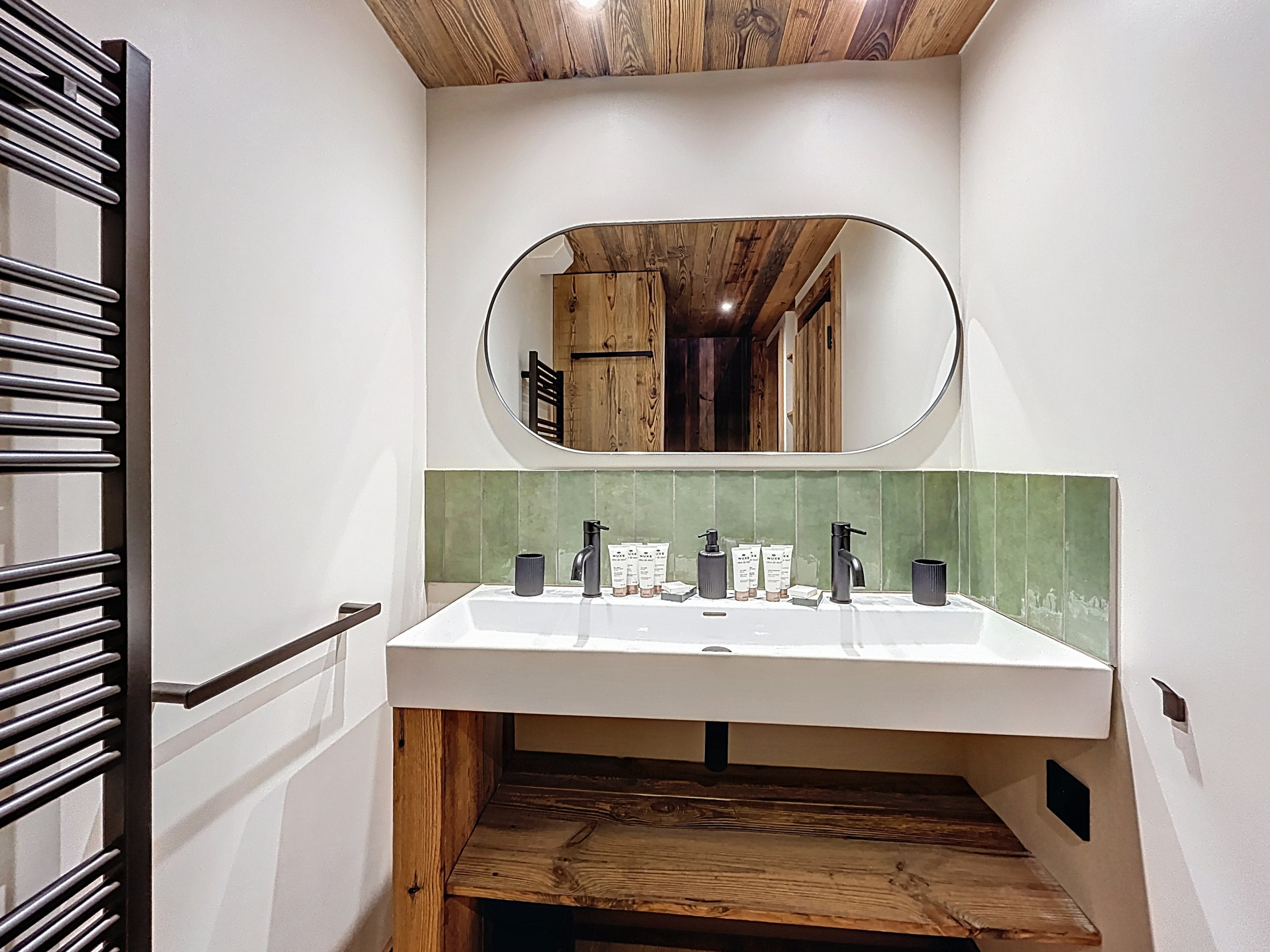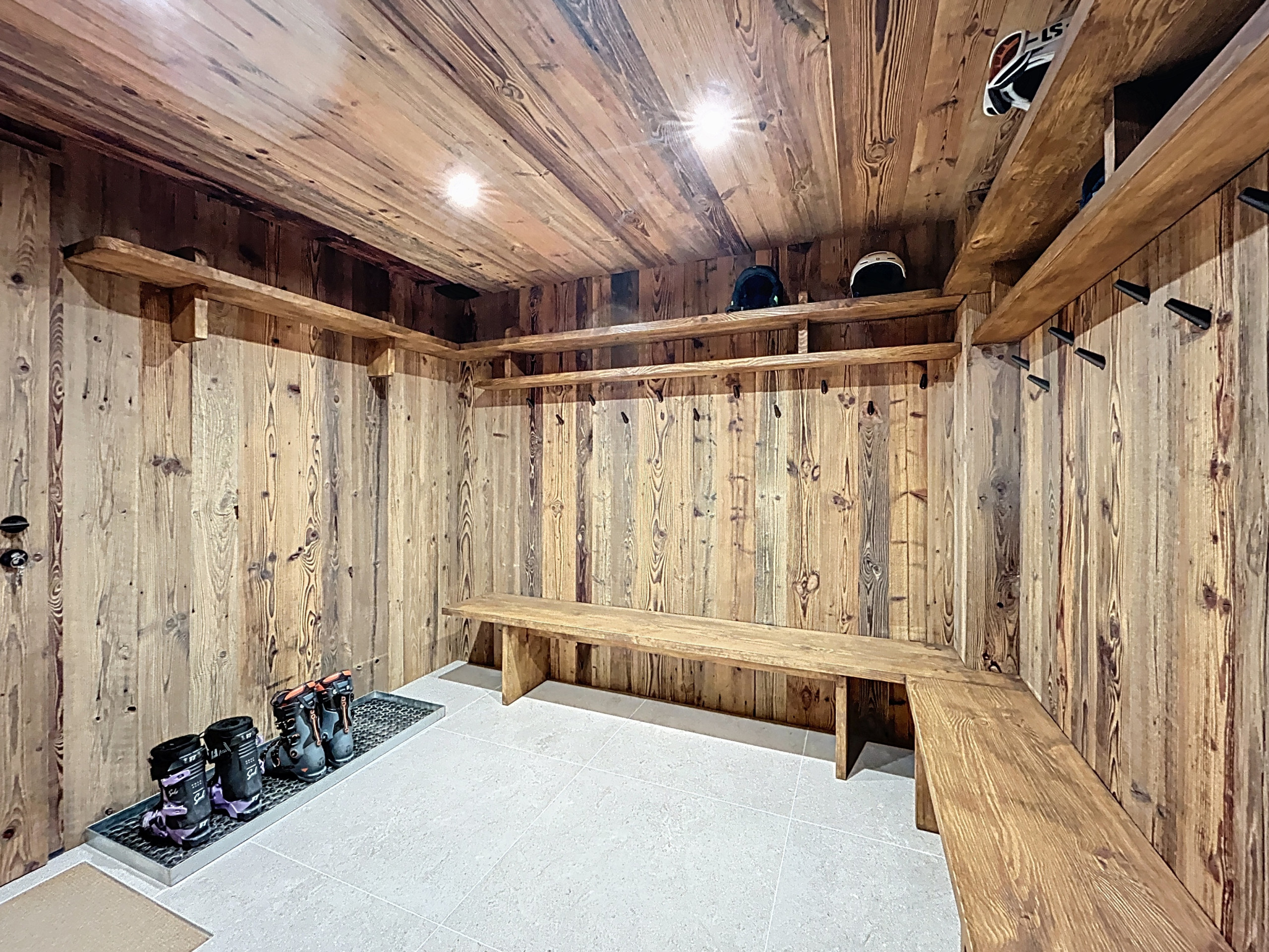 Au rez-de-chaussée, l’entrée avec vestiaire et local à skis dessert deux chambres en suite, chacune équipée d’un lit Queen size, ainsi qu’un WC indépendant. Ce niveau accueille également un dortoir de six couchages, accessible depuis le rez-de-chaussée, disposant de sa salle de bain privative. Le dortoir intègre un filet de détente, pensé comme un espace repos ou lecture, particulièrement apprécié des enfants.